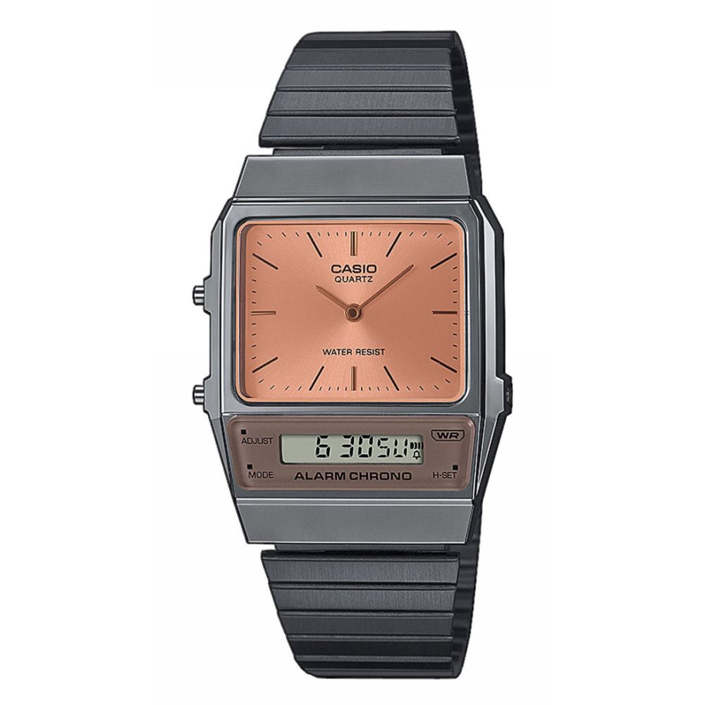 De wijzerplaat van dit horloge heeft een opvallende oranje kleur, wat zorgt voor een speels en dynamisch element. Het materiaal van zowel de band als het horloge zelf is edelstaal, wat zorgt voor duurzaamheid en een luxe uitstraling. Het horloge is van het merk Casio en heeft de productcode AQ-800ECGG-4AEF. De grijze kleur van het merk geeft het horloge een moderne en trendy uitstraling.