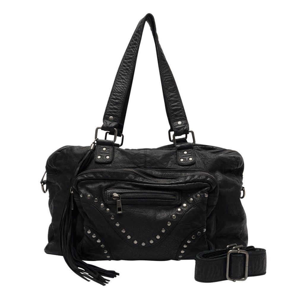 voor dames die stijl en functionaliteit willen combineren. Met een breedte van 37 cm, een diepte van 12 cm en een hoogte van 26 cm, biedt deze tas genoeg ruimte voor al je essentials zonder in te boeten op elegantie.Gemaakt van een luxe mix van 90% leer en 10% katoen, voelt de Mille Rivet Washed niet alleen geweldig aan, maar ziet er ook fantastisch uit. De zilverkleurige hardware geeft een chique touch, terwijl de zwarte kleur met antiek zilver een tijdloze uitstraling biedt die bij elke outfit past.