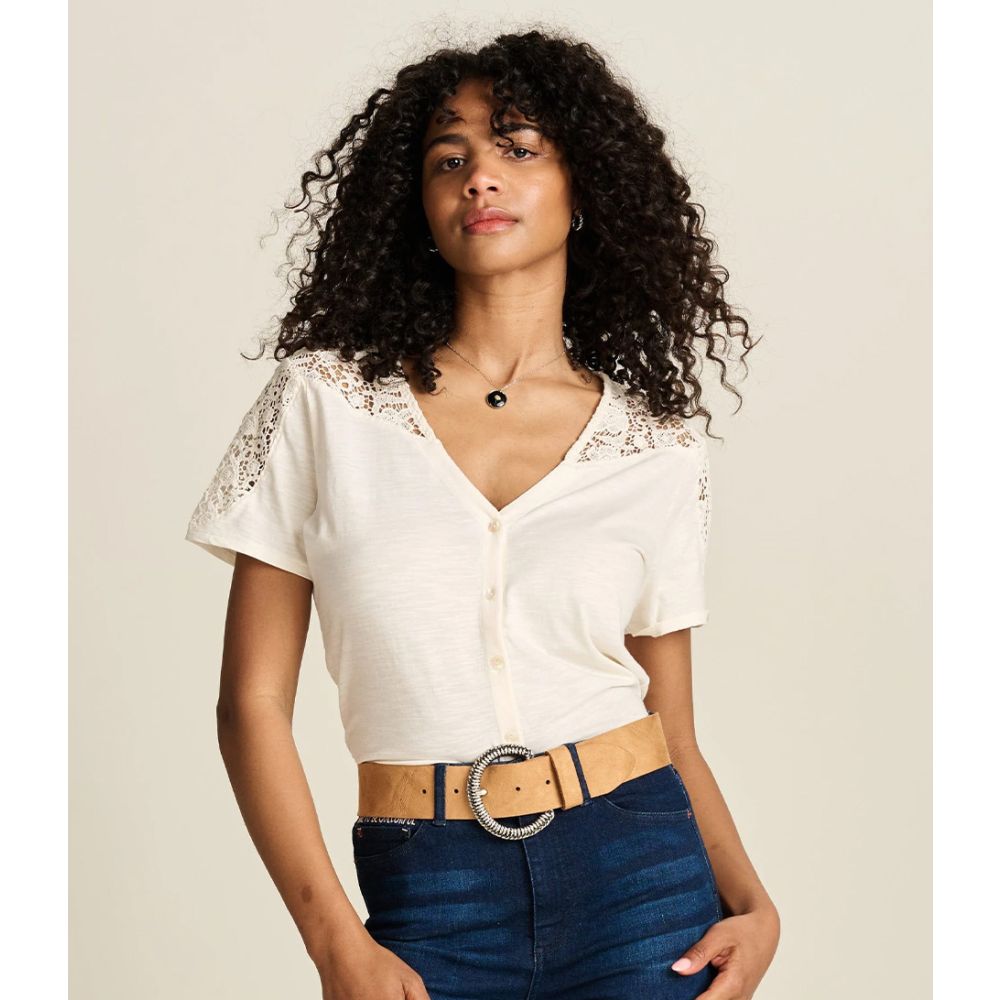 Maak kennis met de T-Shirt Ellen Ecru, jouw nieuwe favoriete basic voor de lente en zomer! Deze stijlvolle dames T-shirt is perfect voor elke gelegenheid, of je nu een casual dagje uit plant of een gezellige brunch met vriendinnen. De V-hals geeft een speelse touch, terwijl de korte mouwen je een frisse uitstraling geven.