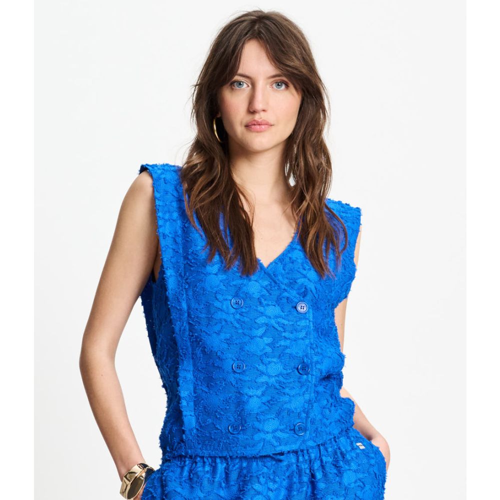 De knoopsluiting aan de voorkant voegt een speelse touch toe en maakt het gemakkelijk om de top aan en uit te trekken. Of je nu een dag op kantoor hebt of een avondje uit, de Top Ocean Blue Jacquard is veelzijdig genoeg om je de hele dag door stijlvol te houden. Voeg deze must-have toe aan je collectie en laat je modehart sneller kloppen!