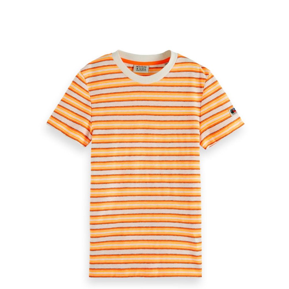 Scotch and Soda Relaxed Fit Yarn Dyed Striped Cotton Linen T Shirt Neon Peach Stripe