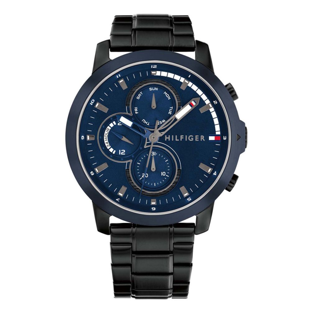 Maak kennis met Jameson, een stijlvol Tommy Hilfiger. Met zijn zwarte kast en blauwe wijzerplaat is dit horloge een echte eyecatcher. De kast heeft een diameter van 46 mm en een dikte van 10 mm, waardoor het horloge een robuuste uitstraling heeft. De horlogeband, gemaakt van hoogwaardig roestvrij staal, heeft een breedte van 23 mm en sluit gemakkelijk met een vouwsluiting.