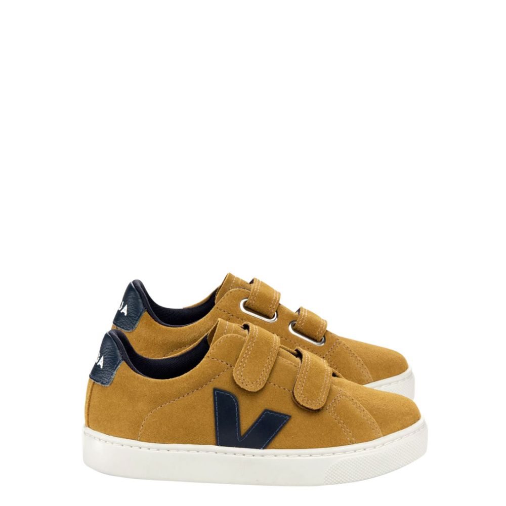 De Small Esplar Suede is een trendy paar Veja staat bekend om zijn kwaliteit en Camel Nautico is de kleurnaam van deze specifieke schoen. De productcode van deze sneaker is SV0303053C en het behoort tot de Esplar serie. Met de handige klittenbandsluiting kunnen kinderen gemakkelijk hun schoenen aan- en uittrekken. De ronde neus geeft de sneakers een speelse uitstraling.